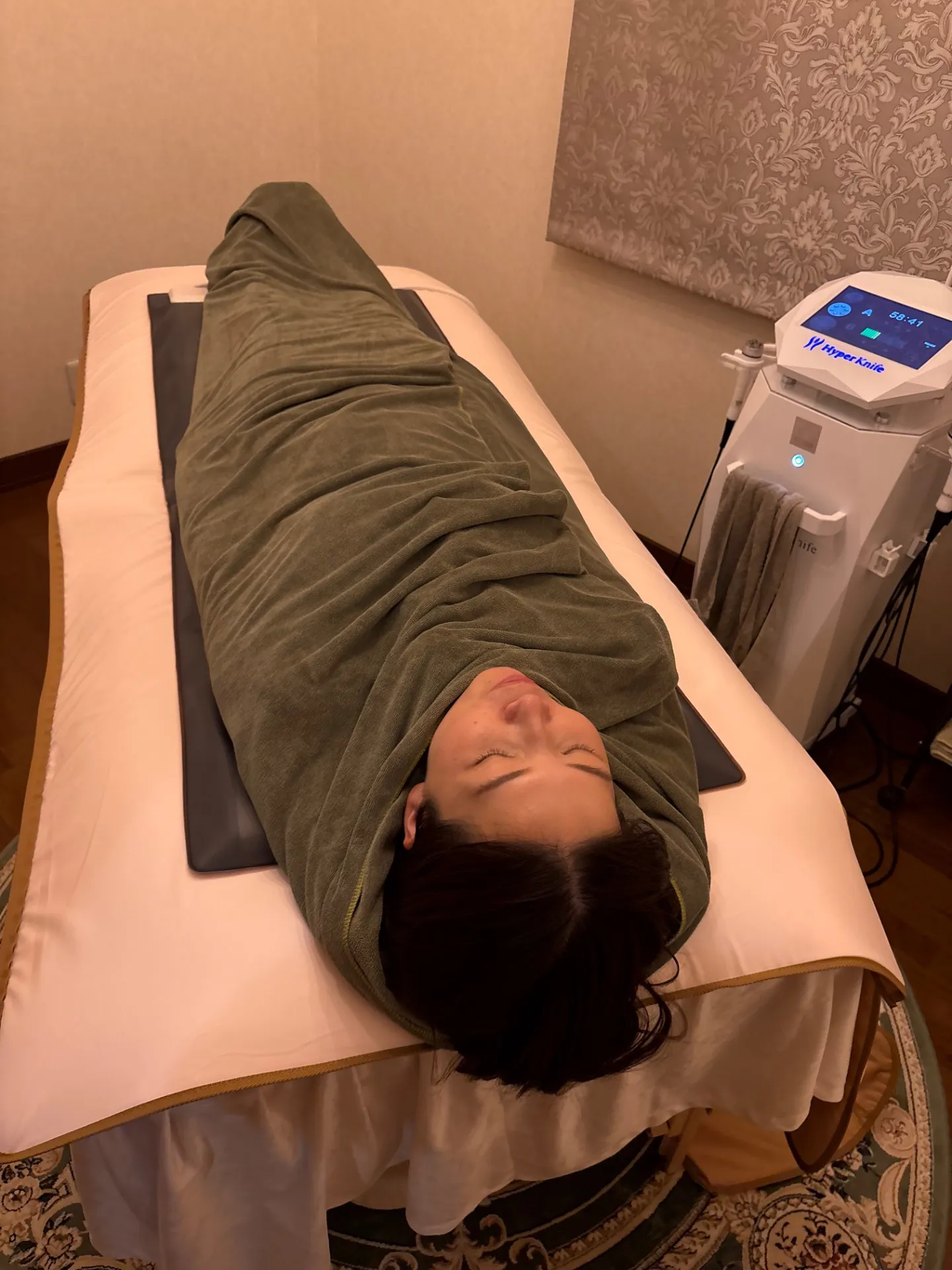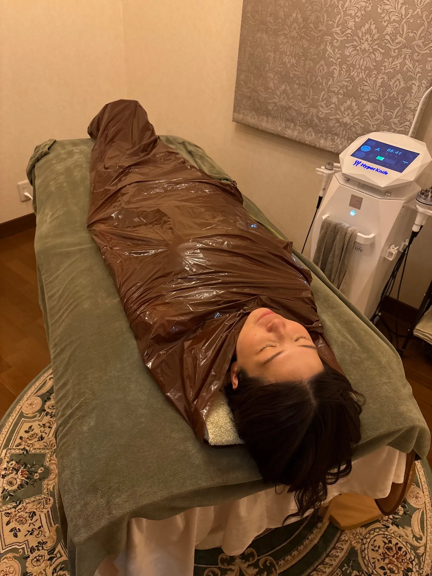 特におすすめなのがダイエット。ハイパーナイフだけでももちろん効果はありますがより効果を高めるために一部のケアではハイパーラドンマットにくるまり、しっかりと汗をかいてもらいます。