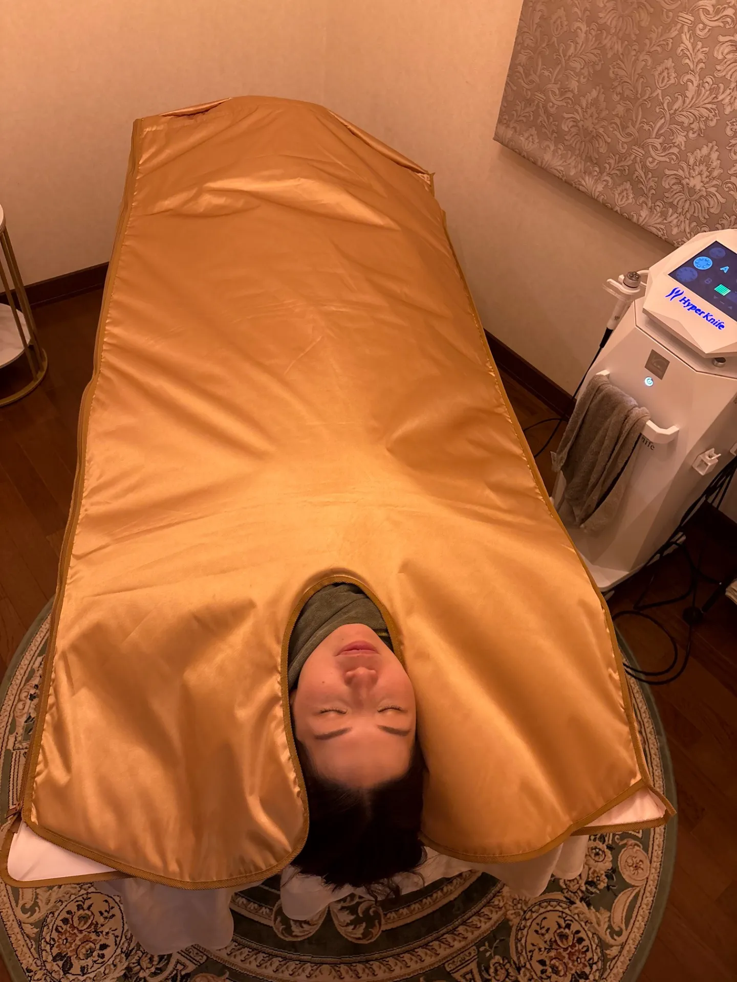 どのようにというと、、ベッドに横になりビニールシートに包まれます。次に薄手の掛け物でより熱を逃さないよう包みます。更に専用のカバーでガッチリ包みあとは寝るだけ。30分ほど横になると個人差はありますが、汗が吹き出てきます。